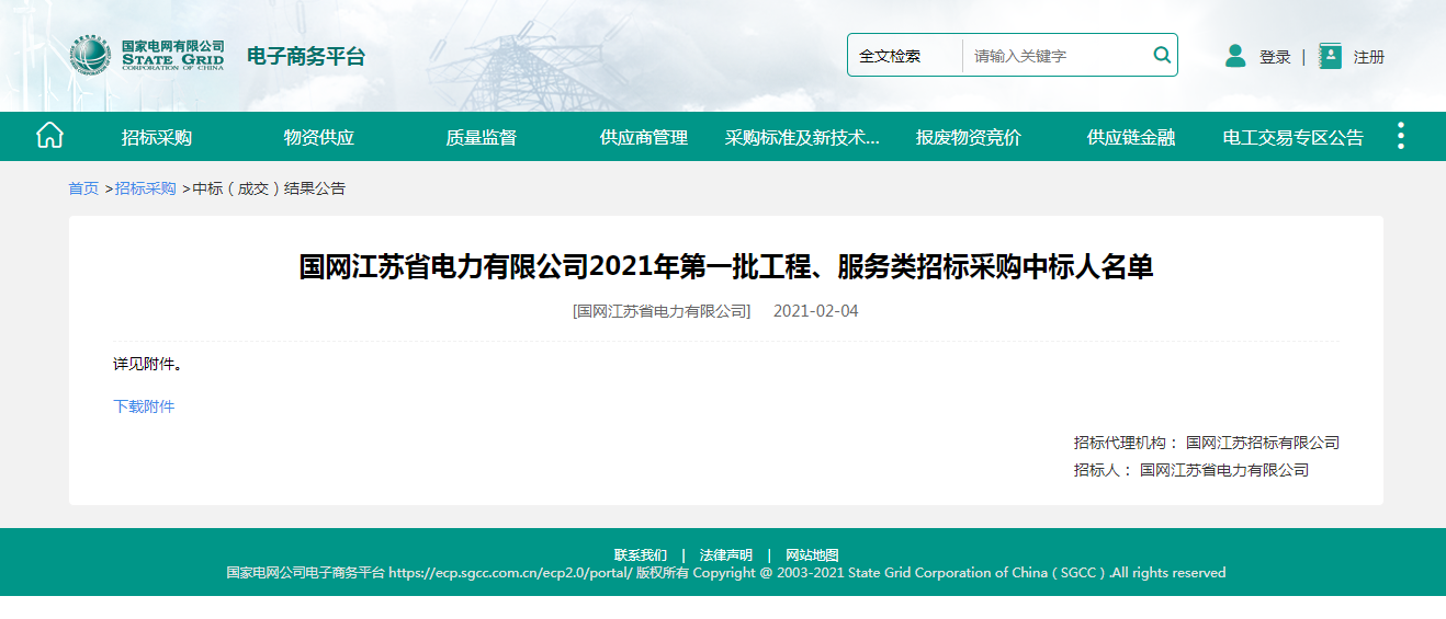 喜報(bào):天津津海天源中標(biāo)國(guó)網(wǎng)江蘇省電力有限公司2021年第一批工程、服務(wù)類(lèi)招標(biāo)采購(gòu)項(xiàng)目